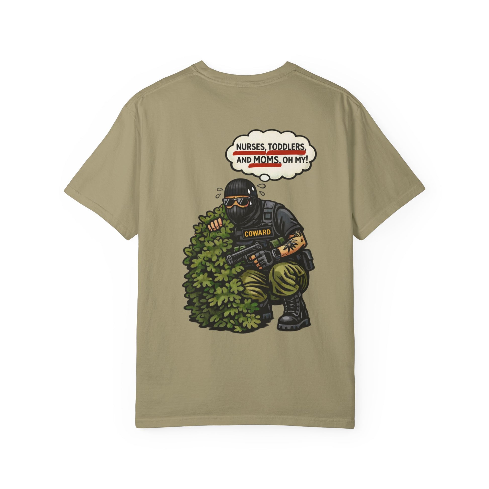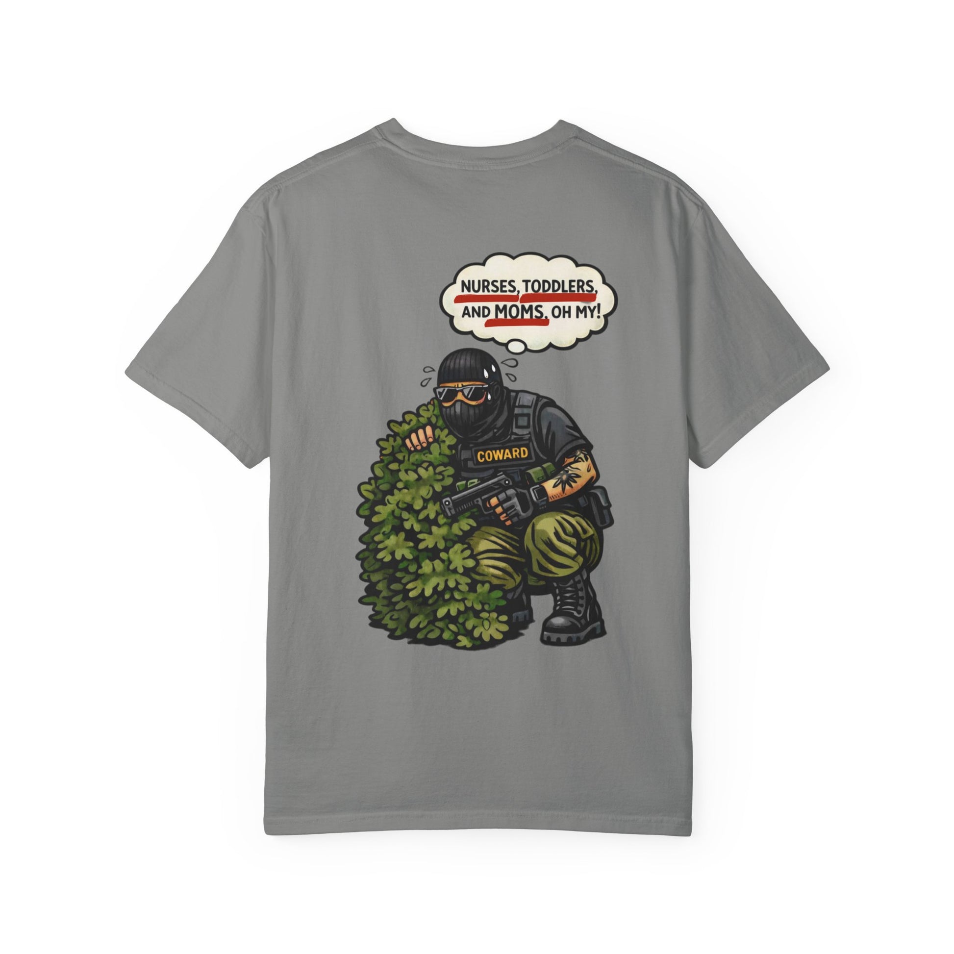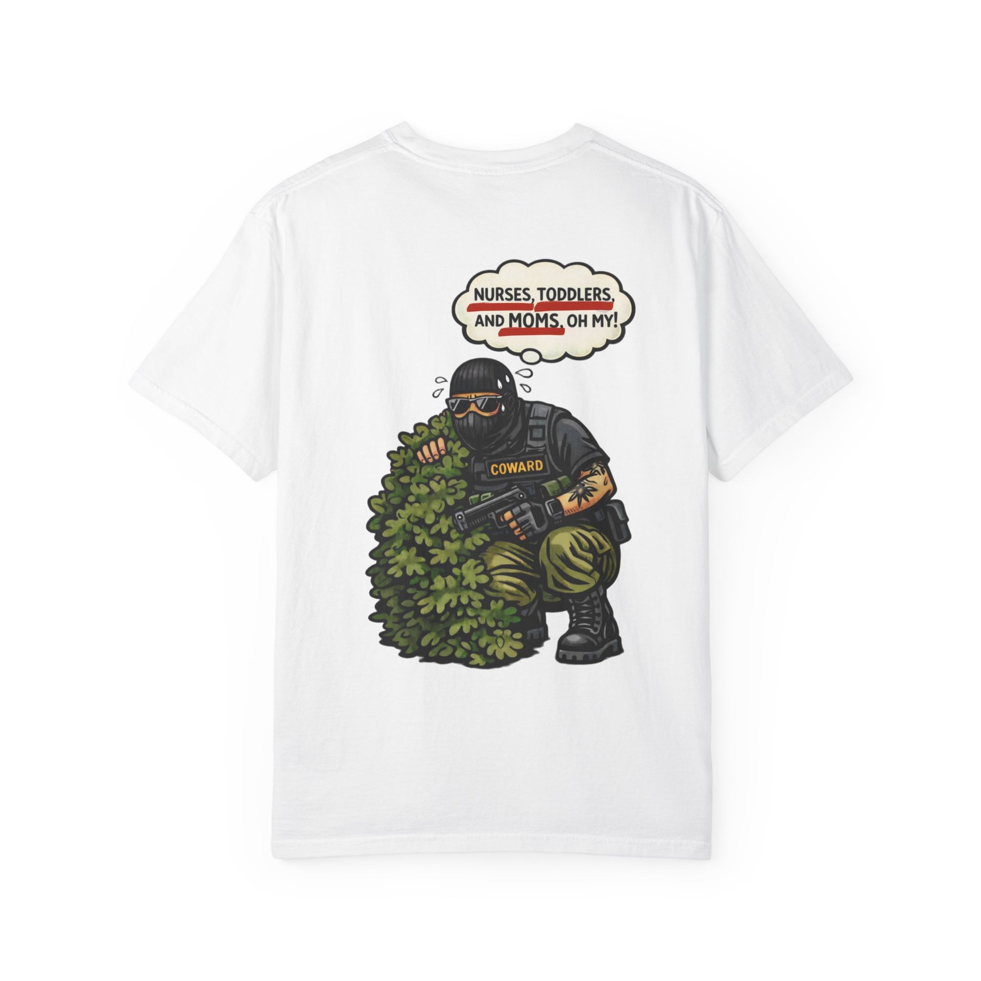 This tee drags the tough-guy myth straight into the daylight. The image says it all: heavy gear, heavy panic, hiding from the most harmless “threats” imaginable. Nurses. Moms. Kids. The contrast is the joke.