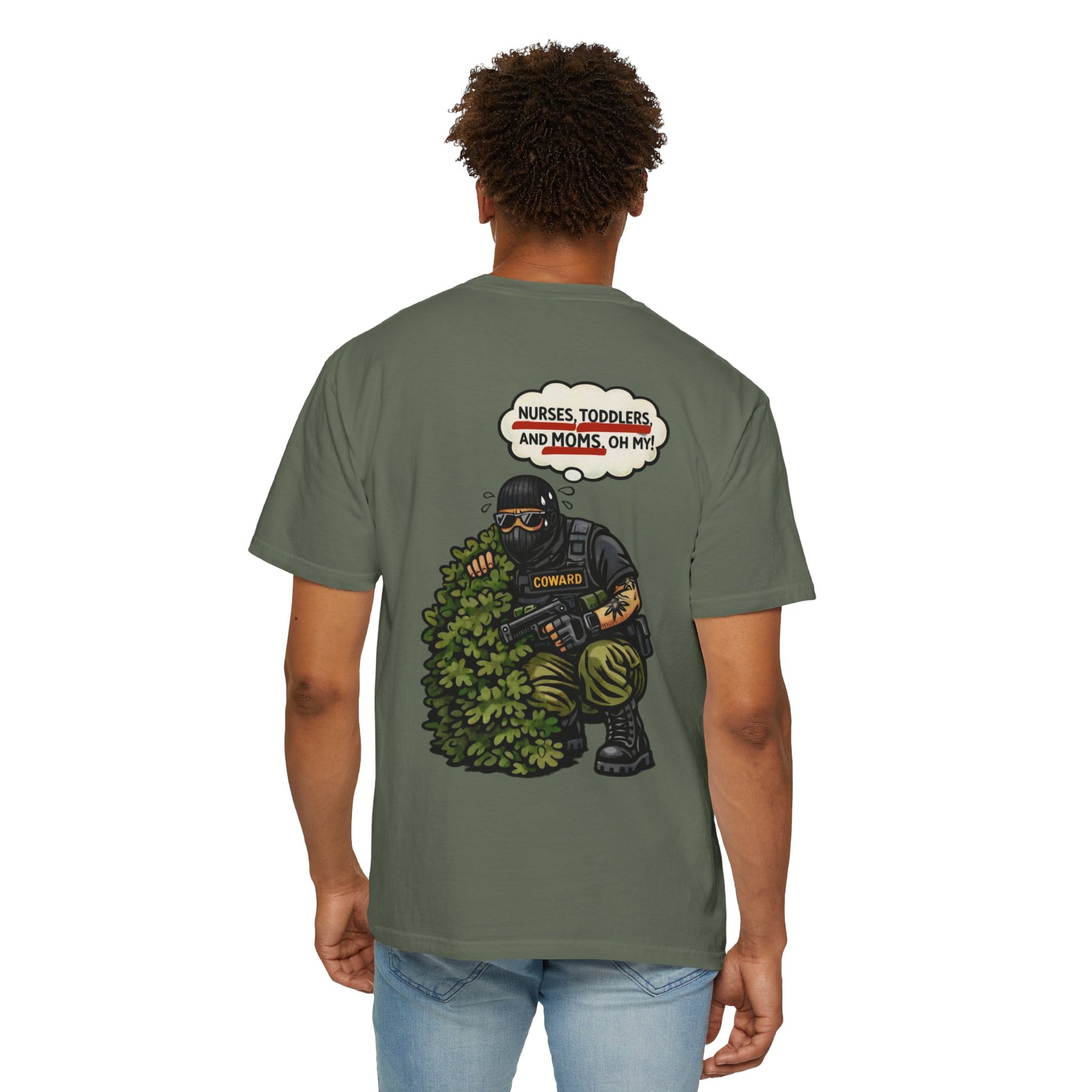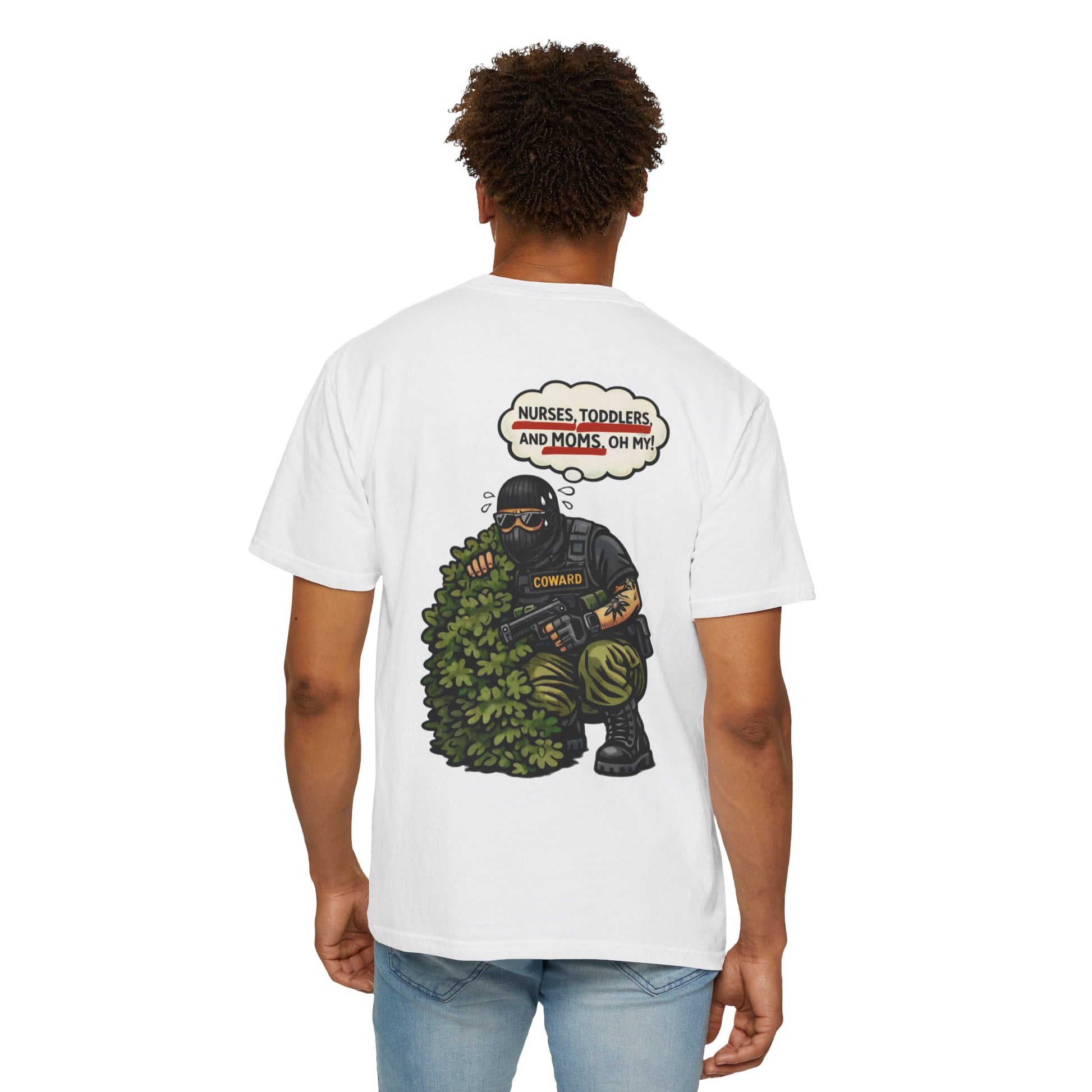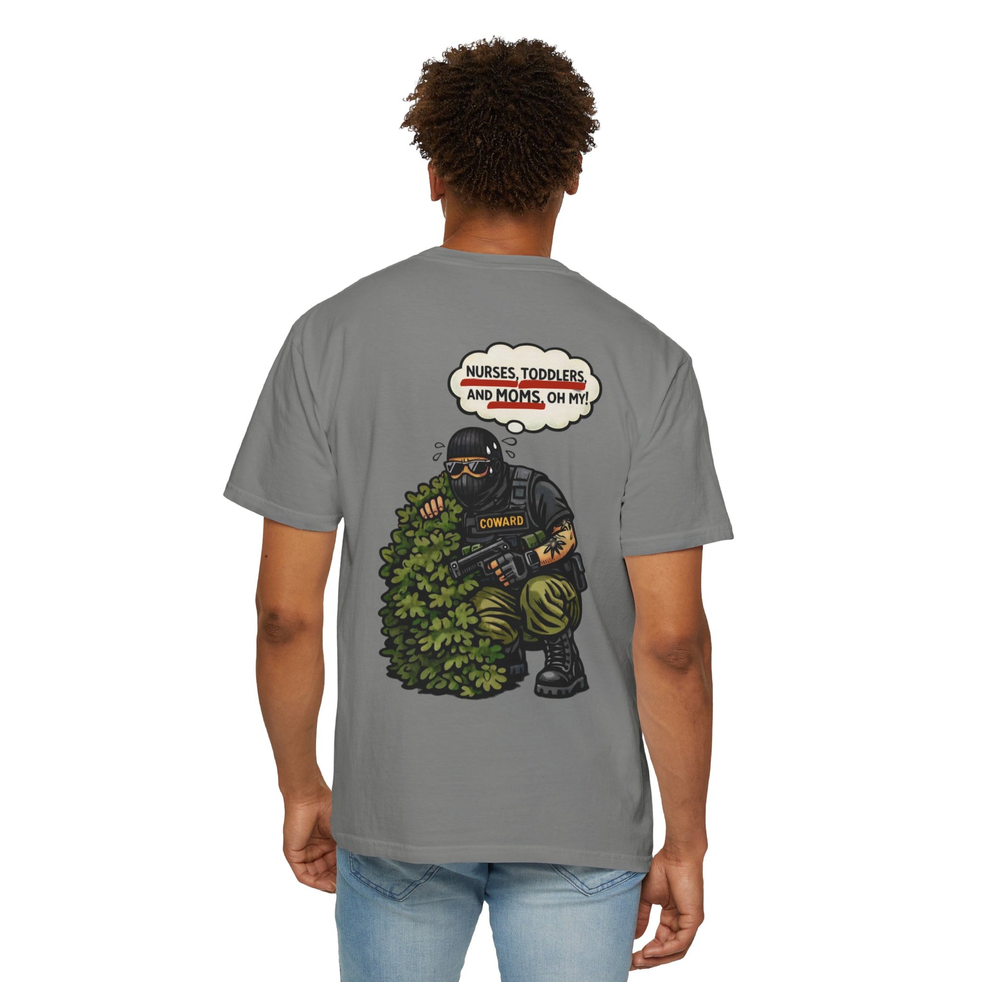 This tee drags the tough-guy myth straight into the daylight. The image says it all: heavy gear, heavy panic, hiding from the most harmless “threats” imaginable. Nurses. Moms. Kids. The contrast is the joke.