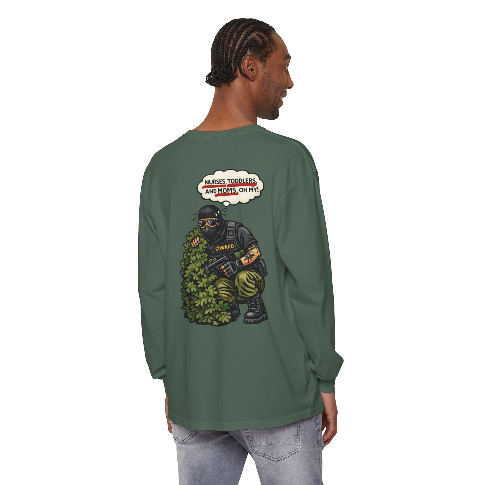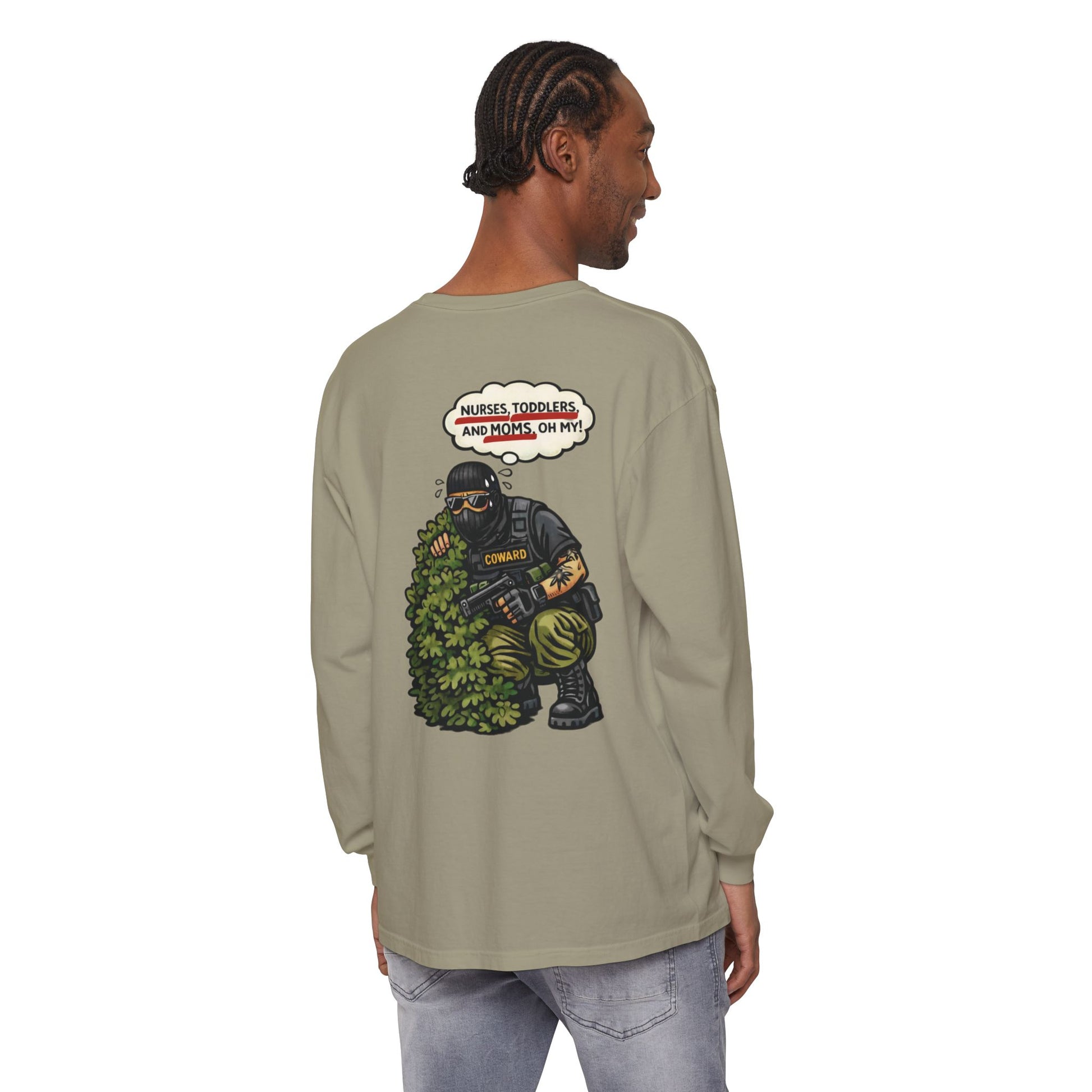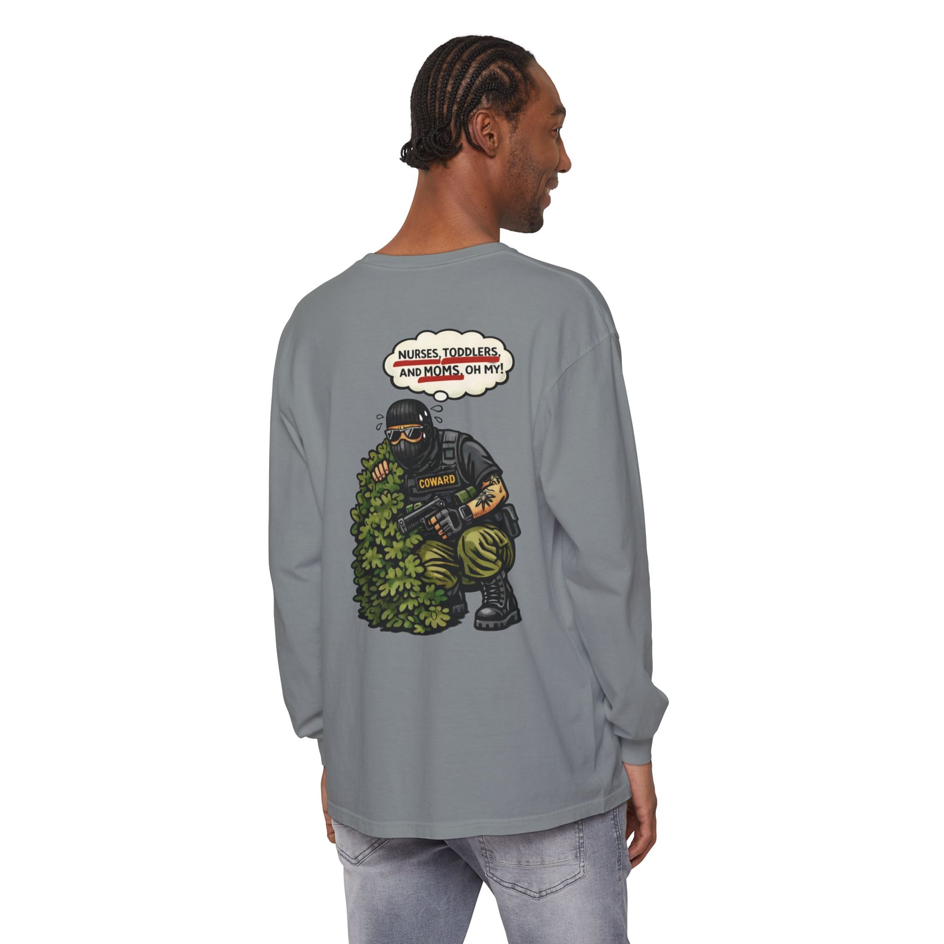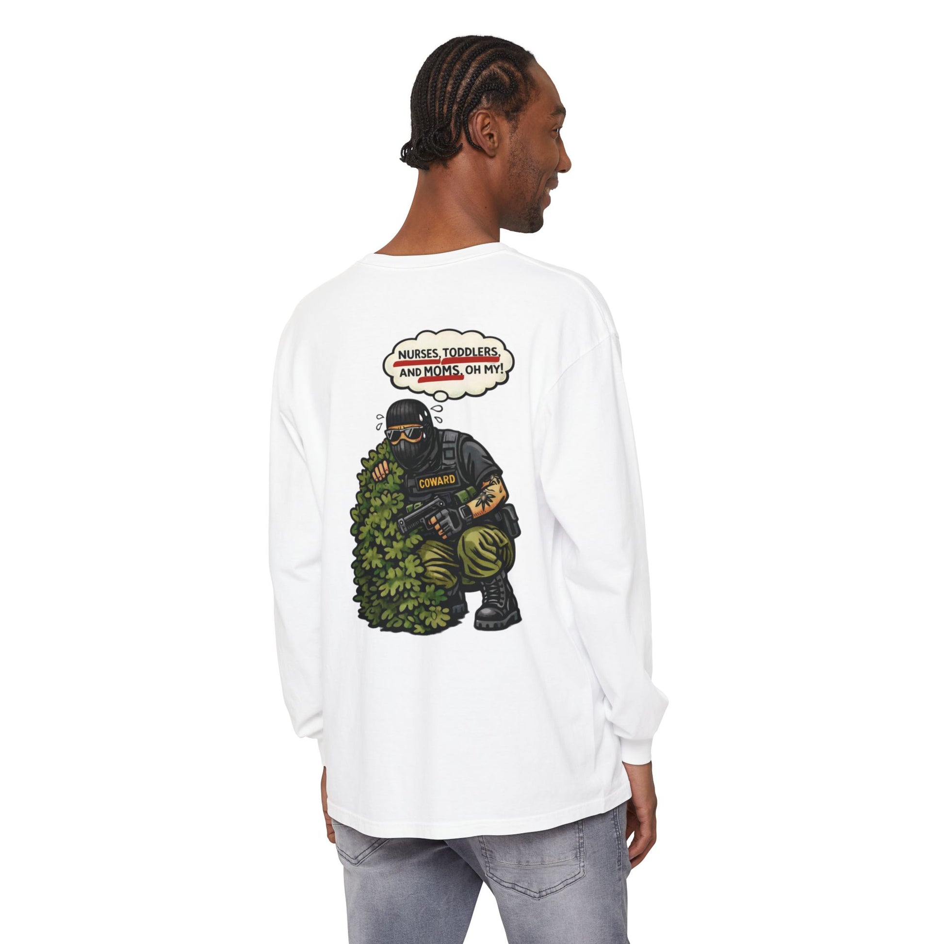 This long sleeve keeps the satire sharp and the message unmissable. It calls out the performance of authority: the hiding, the panic, the post-event storytelling meant to soften what everyone already saw.