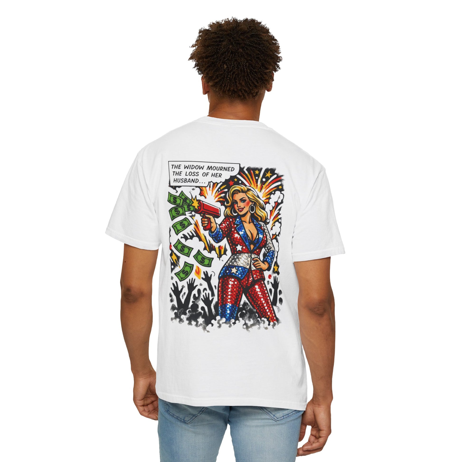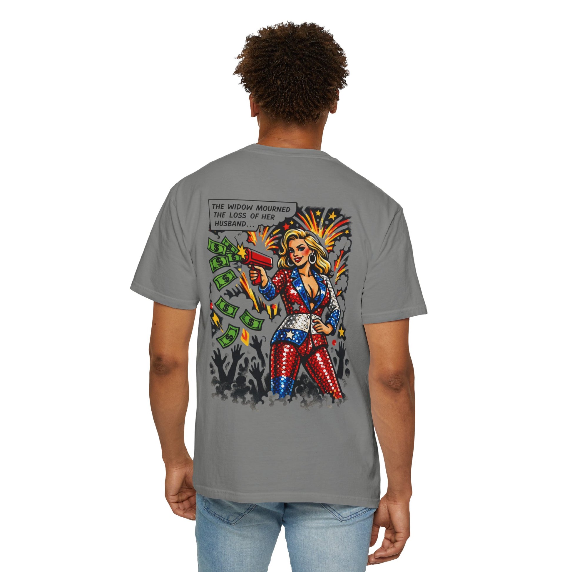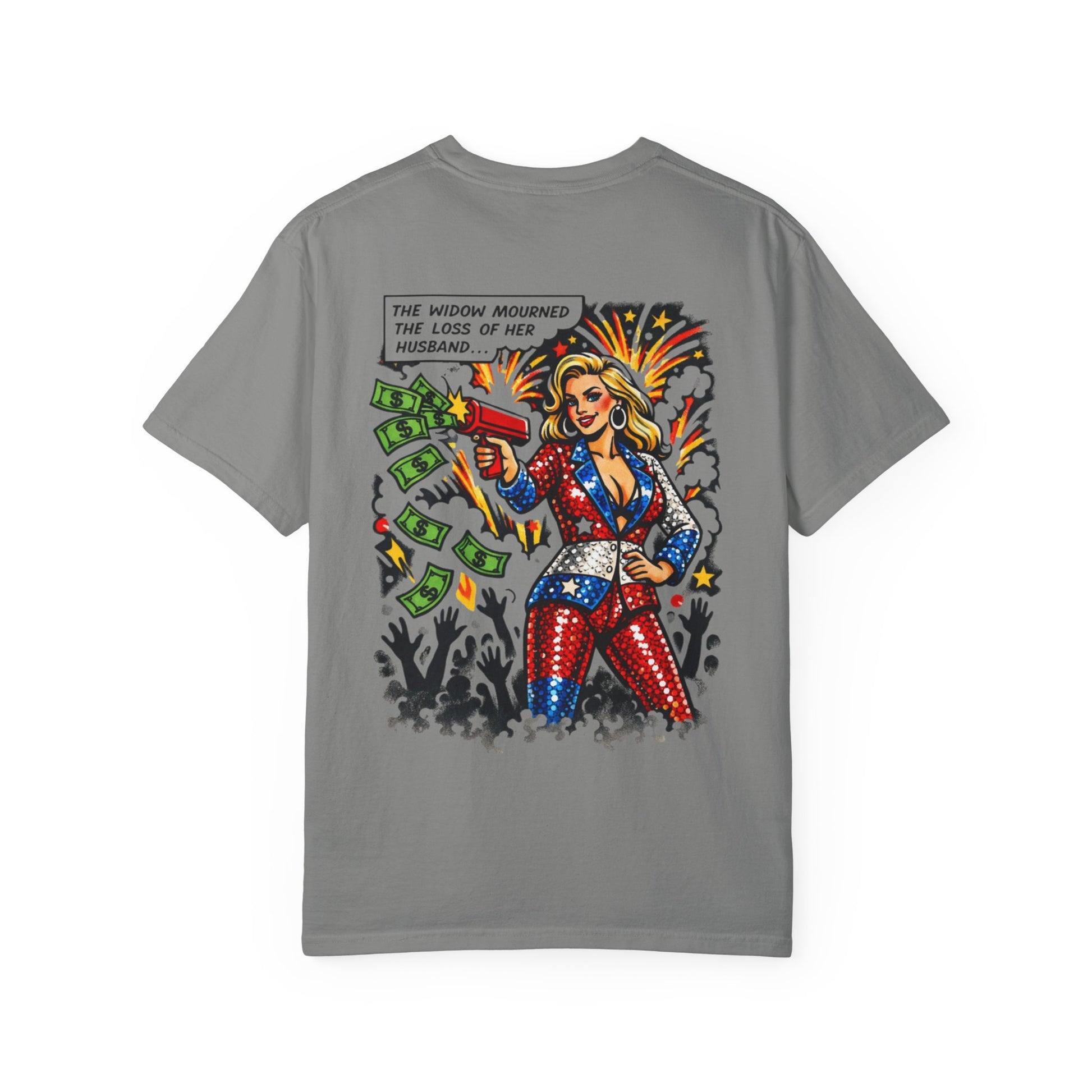 This tee skewers the modern performance of mourning, where loss becomes content, outrage becomes currency, and sorrow shows up right on schedule. The artwork goes full spectacle: fireworks, cash flying, cameras up, grief perfectly framed.