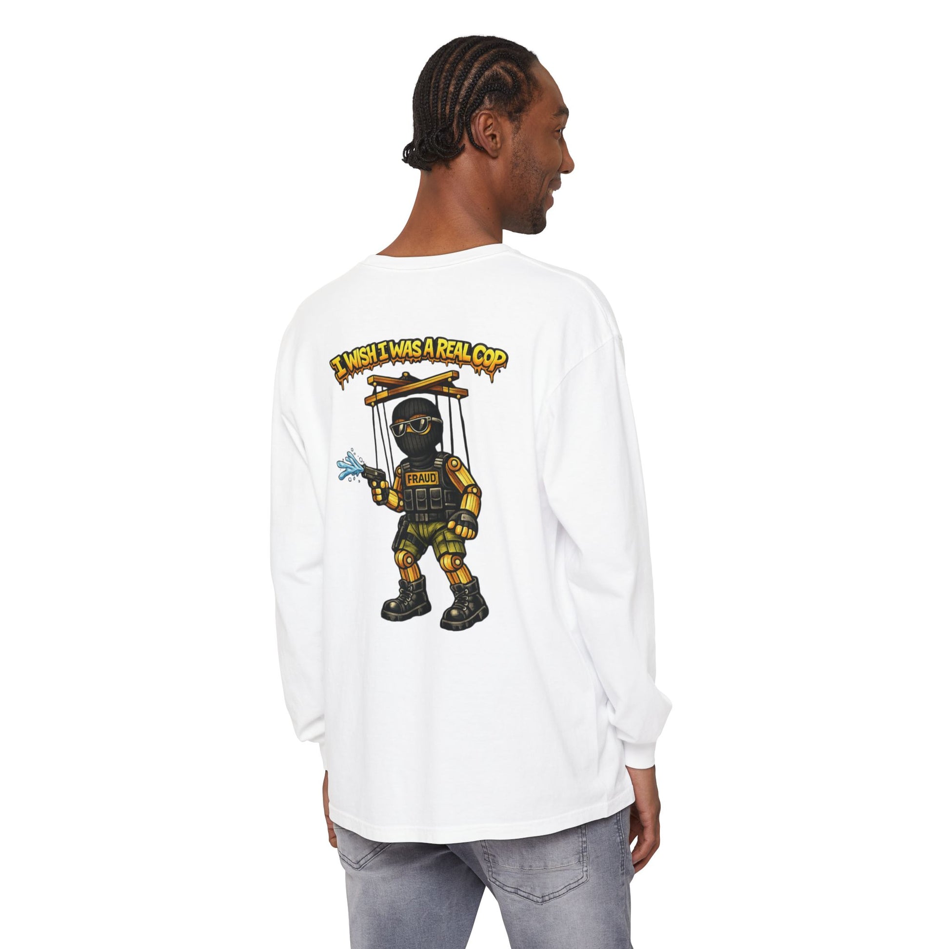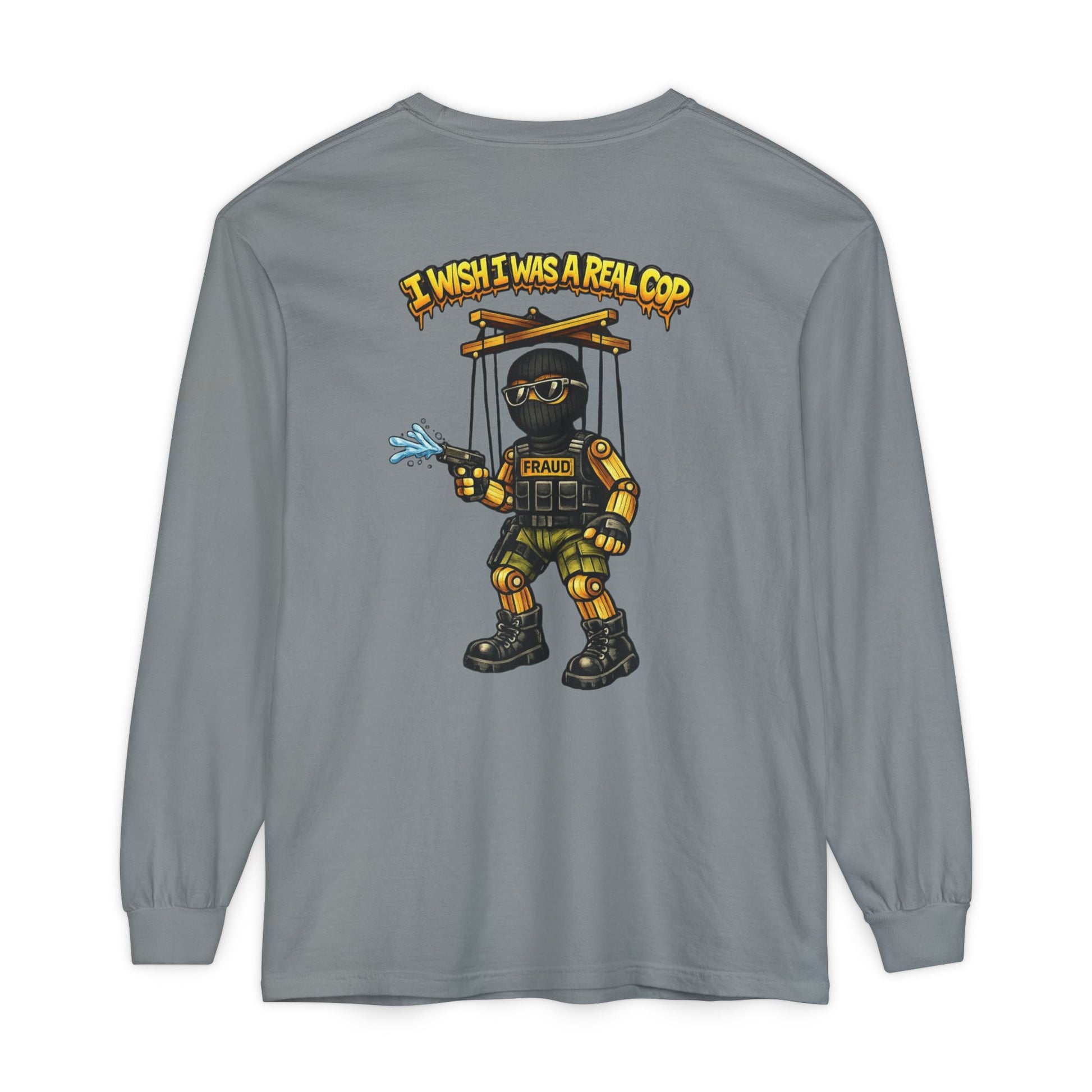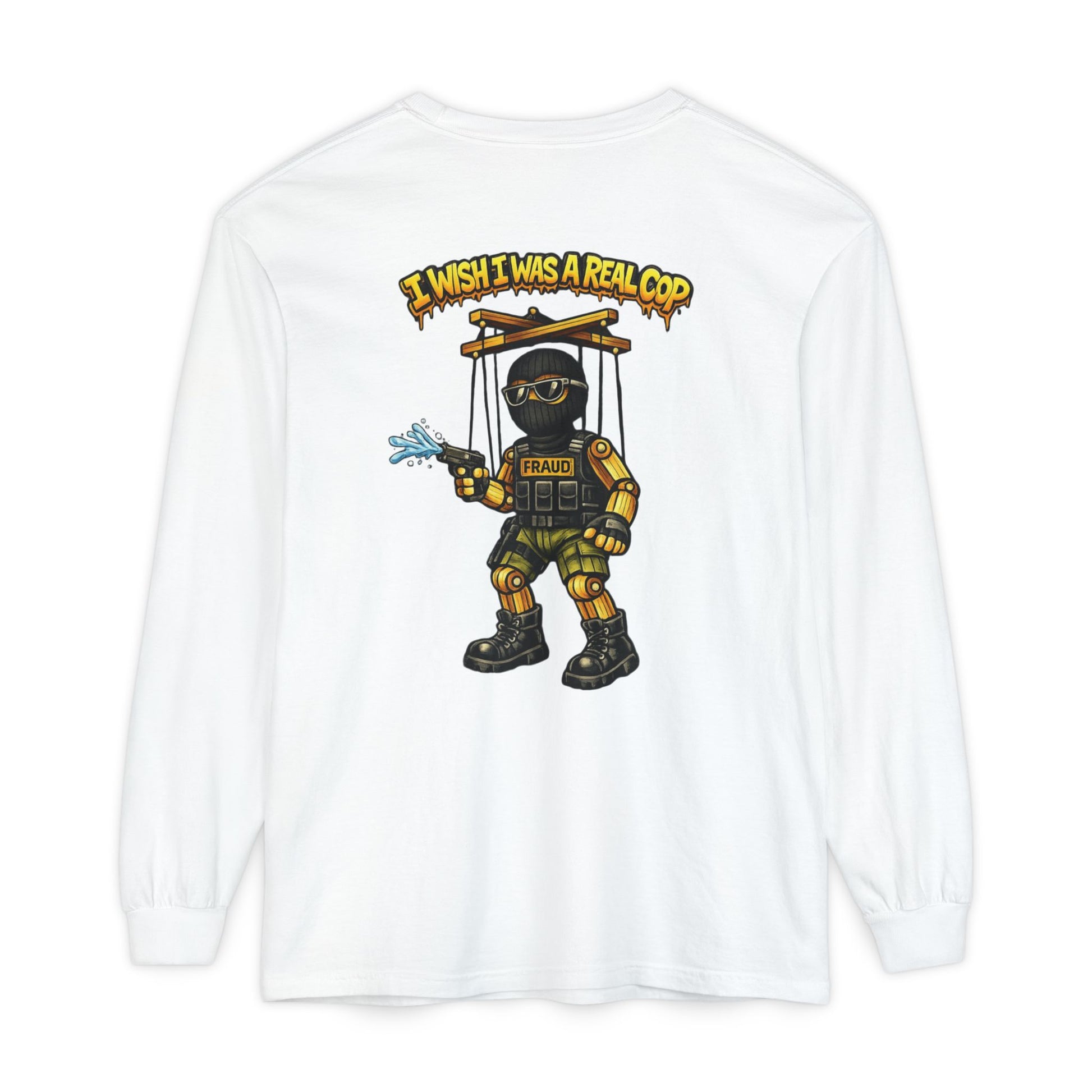 This long sleeve keeps the critique front and center: authority that wants the look without the accountability, the power without the responsibility. Puppet strings exposed. Illusions gone.