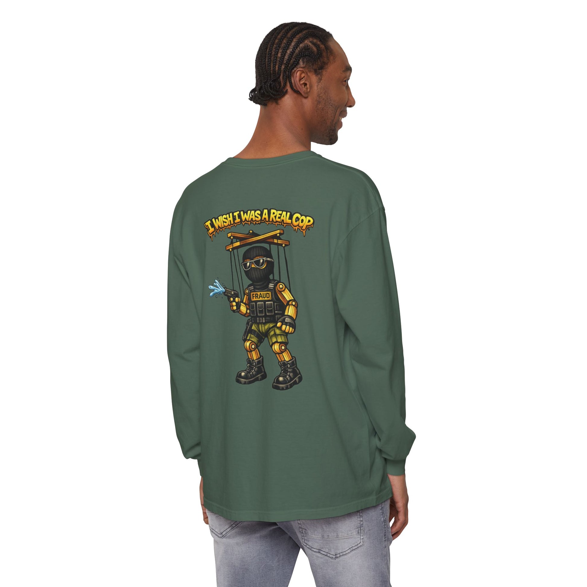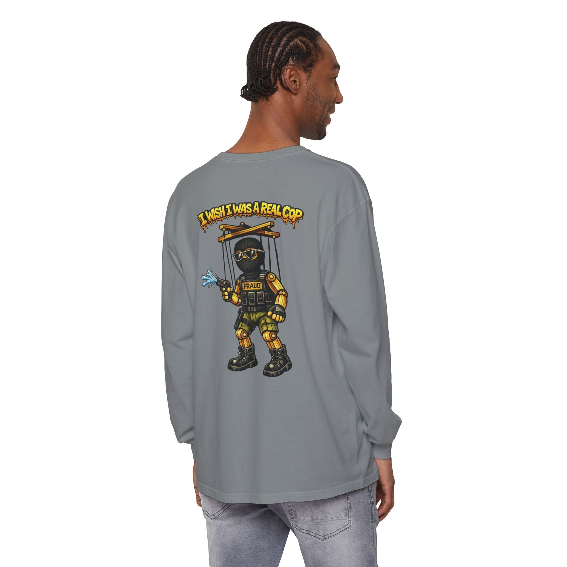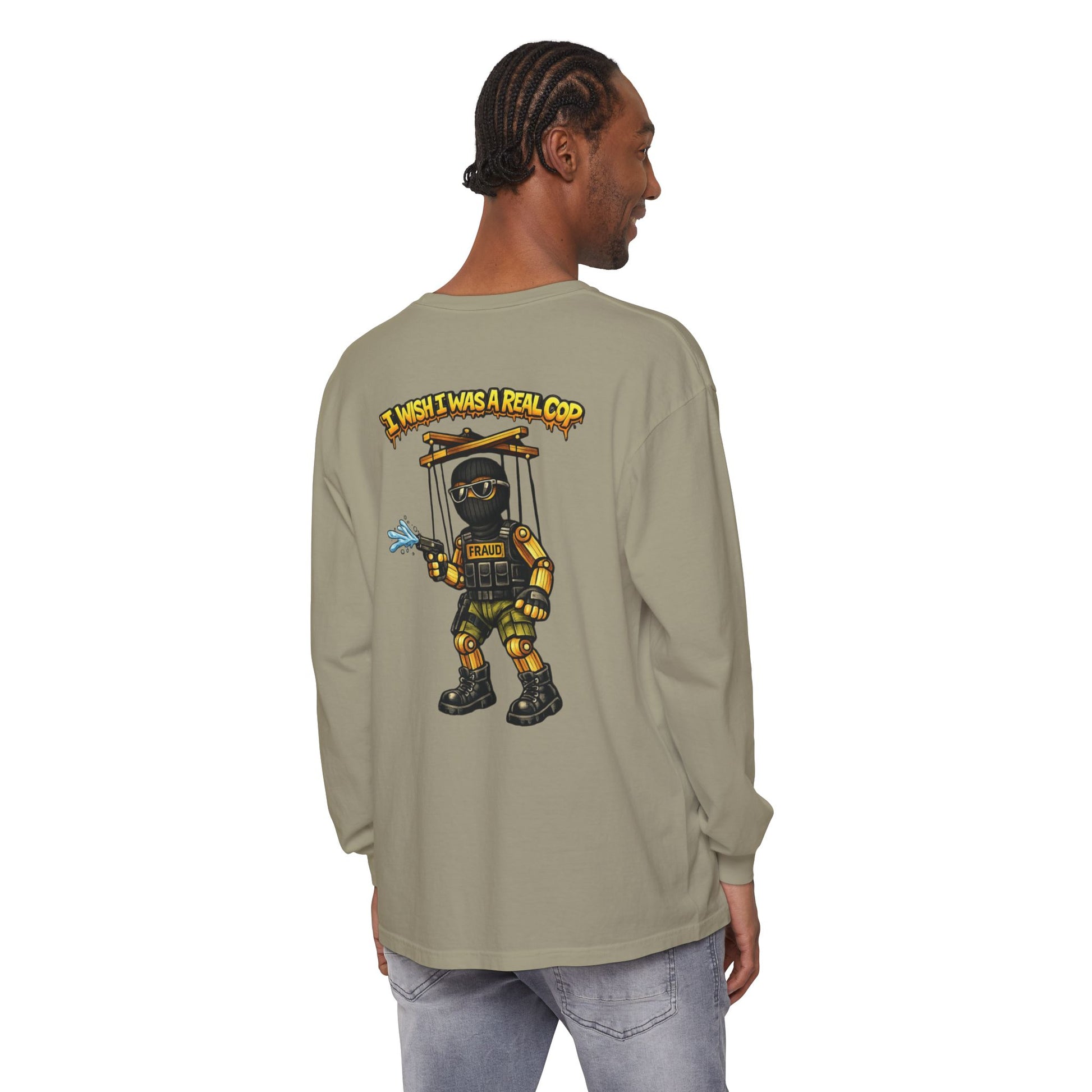 This long sleeve keeps the critique front and center: authority that wants the look without the accountability, the power without the responsibility. Puppet strings exposed. Illusions gone.