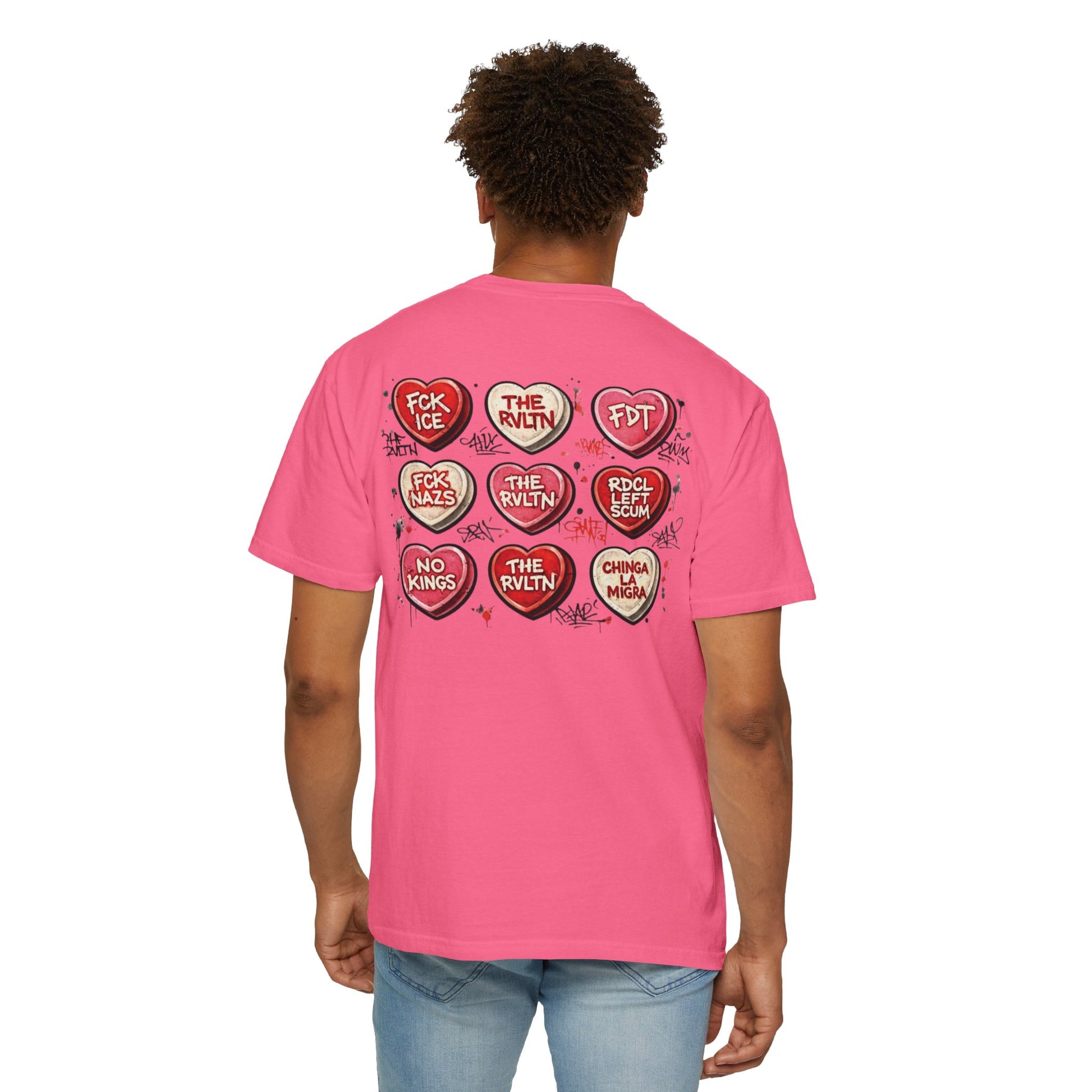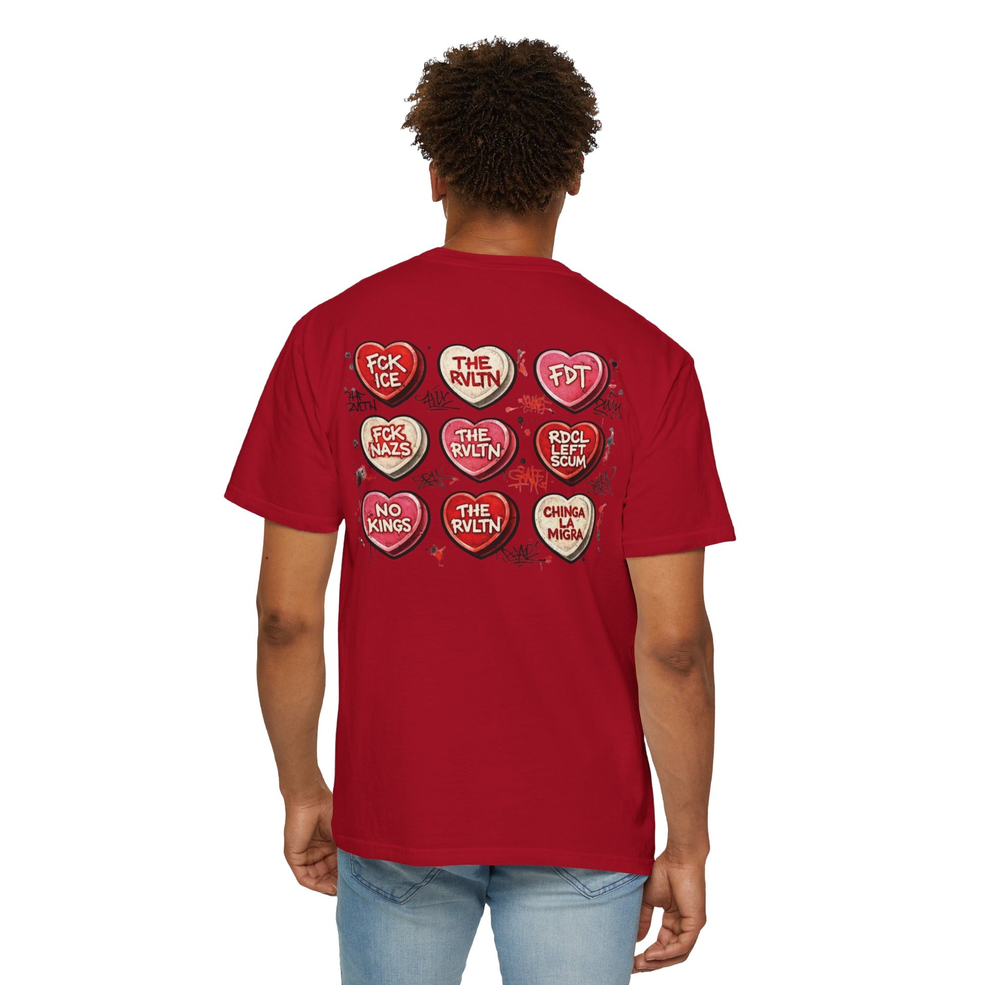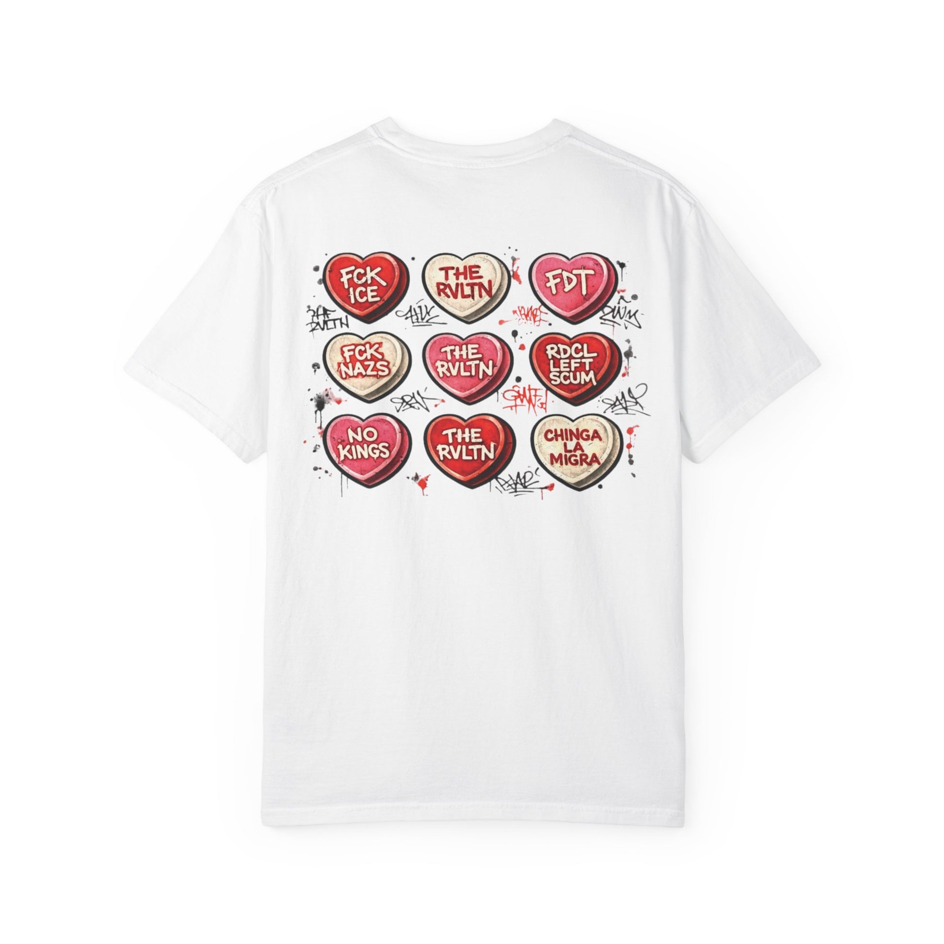 This tee flips the sickly-sweet holiday aesthetic on its head, serving classic conversation-heart vibes with an unmistakable edge. It’s the only correct way to participate in any holiday while still making your stance crystal clear: no kings, no fascists, no mercy for bad takes.at it is. This shirt is perfect for people who love irony, sarcasm, and making a point without saying a word. Equal parts protest and punchline, it’s holiday spirit for those who don’t do subtle.